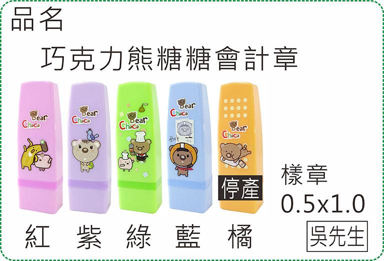 範例,巧克力熊糖糖會計章,限0.5x1.0cm,吳先生,少女體,橫式,有框,水性 紅色,紫色,1