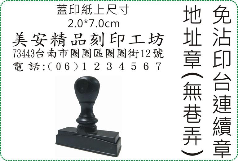 範例,2x7cm 橫式免沾印台連續地址章280元,美安精品刻印工坊*73443台南市圈圈區圈圈街12號*電話:(06)1234567,2.0x7.0cm,無框,楷書體,水性 藍色,1