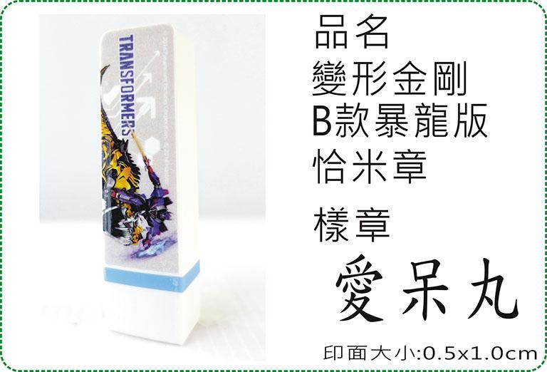 範例,變形金剛B款暴龍版恰米章120元,限0.5x1.0cm,愛呆丸,少女體,橫式,有框,水性 紅色