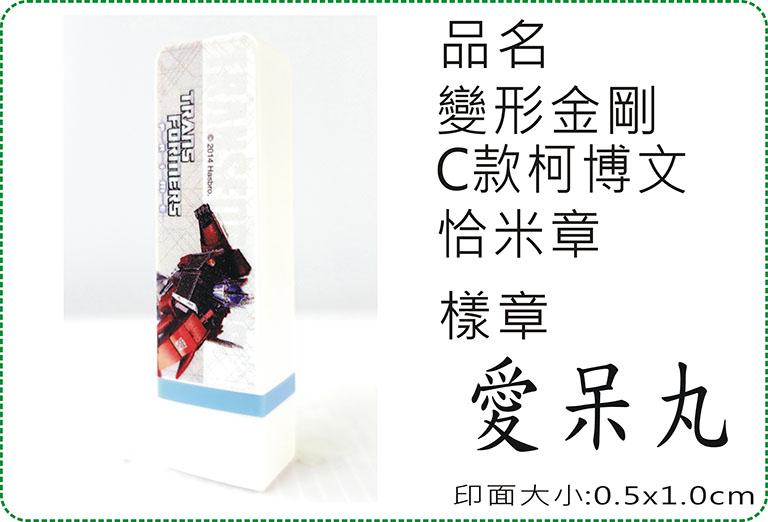 範例,變形金剛C款柯博文恰米章120元,限0.5x1.0cm,愛呆丸,少女體,橫式,有框,水性 紅色